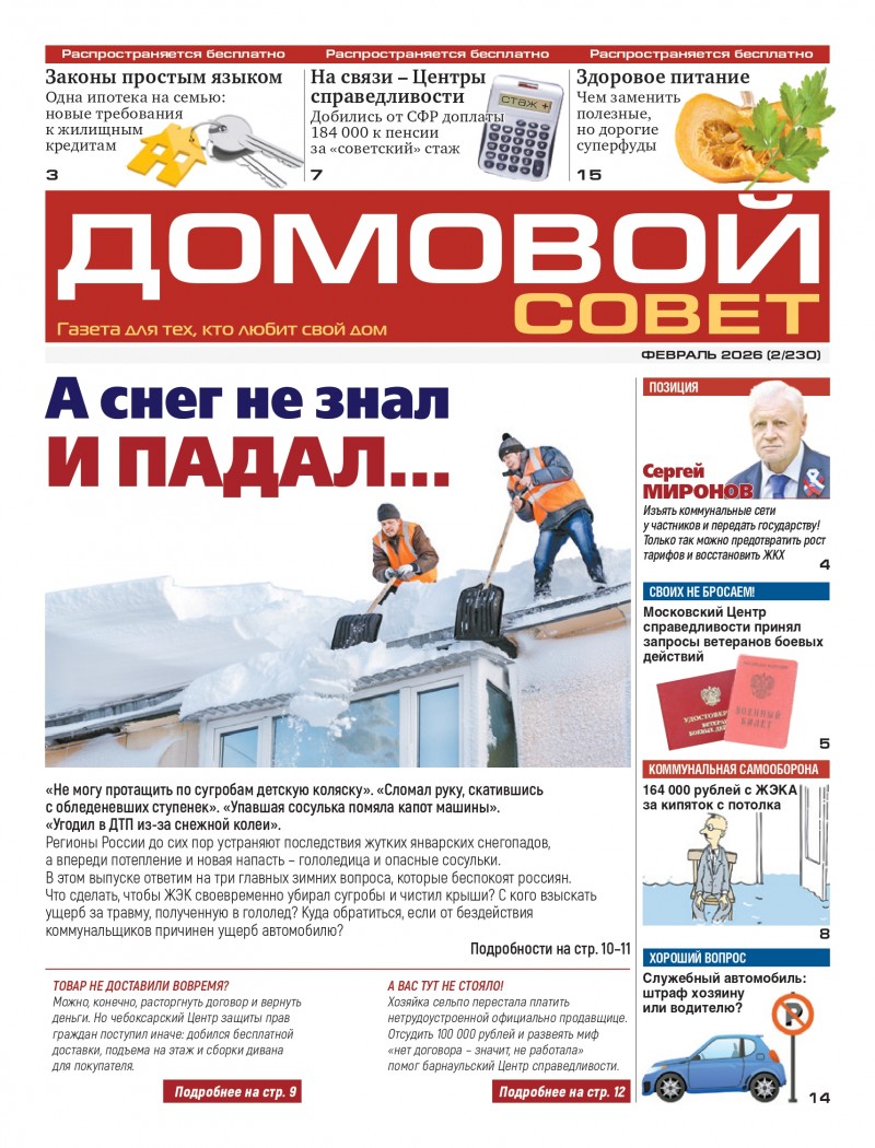 В этом выпуске ответим на три главных зимних вопроса, которые беспокоят россиян. Что сделать, чтобы ЖЭК своевременно убирал сугробы и чистил крыши? С кого взыскать ущерб за травму, полученную в гололед. Куда обратиться, если от бездействия коммунальщиков причинен ущерб автомобилю. Подробности – на развороте февральского "Домового" с 10-й на 11-ю страницы.