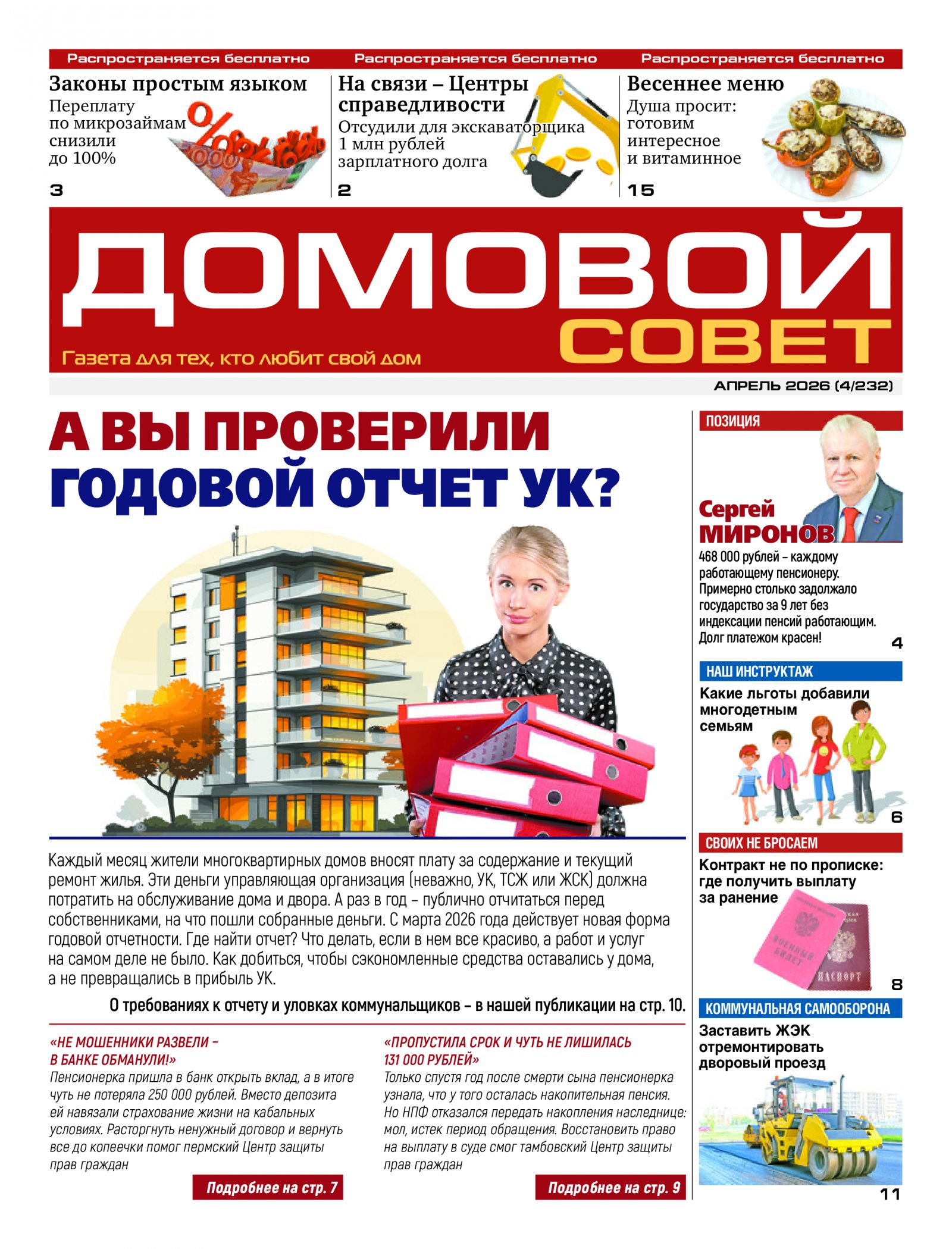 Каждый месяц жители многоквартирных домов вносят плату за содержание и текущий ремонт жилья. Эти деньги управляющая организация (неважно, УК, ТСЖ или ЖСК) должна потратить на обслуживание дома и двора. А раз в год – публично отчитаться перед собственниками, на что пошли собранные деньги. С марта 2026 года действует новая форма годовой отчетности. Где найти отчет? Что делать, если в нем все красиво, а работ и услуг на самом деле не было. Как добиться, чтобы сэкономленные средства оставались у дома, а не превращались в прибыль УК. О требованиях к отчету и уловках коммунальщиков – в нашей публикации на 10-й странице.